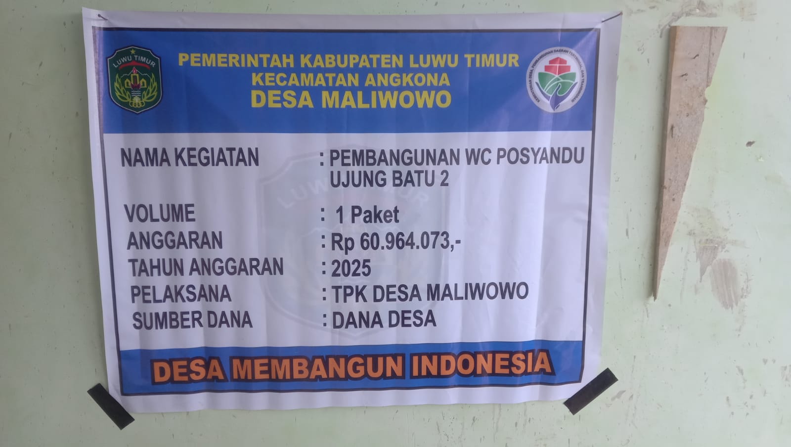 ANGKONA, FAKJUR — Pemerintah Desa (Pemdes) Maliwowo, Kecamatan Angkona, Kabupaten Luwu Timur, Sulawesi Selatan, memanfaatkan Dana Desa (DD) Tahun Anggaran 2025 untuk pembangunan fasilitas WC Posyandu di Dusun Ujung Batu II.