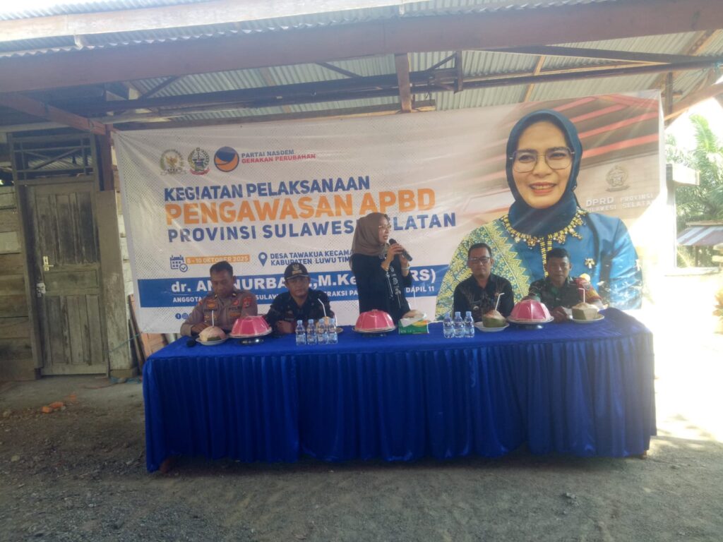 Angkona,FAKJUR— Anggota DPRD Provinsi Sulawesi Selatan, dr. Ani Nurbani, M.Kes, dari Fraksi Partai NasDem (Daerah Pemilihan XI), melaksanakan kegiatan pengawasan pelaksanaan APBD Provinsi Sulawesi Selatan di Desa Tawakua, Kecamatan Angkona, Kabupaten Luwu Timur, Kamis (9/10/2025).