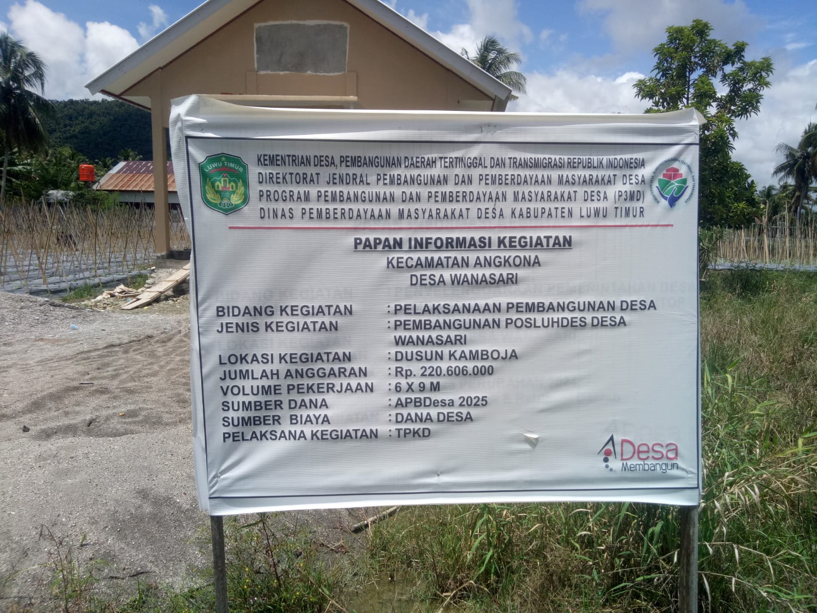 Angkona,Fakjur — Pemerintah Desa Wanasari, Kecamatan Angkona, Kabupaten Luwu Timur, mengalokasikan Dana Desa (DD) Tahun Anggaran 2025 untuk pembangunan Pos Penyuluhan Desa (Posluhdes) di Dusun Kamboja. Pembangunan fasilitas ini memiliki ukuran 6 x 9 meter dengan total anggaran sebesar Rp220.606.000, yang seluruhnya bersumber dari Dana Desa 2025. Pelaksana kegiatan adalah Tim Pelaksana Kegiatan Desa (TPKD).