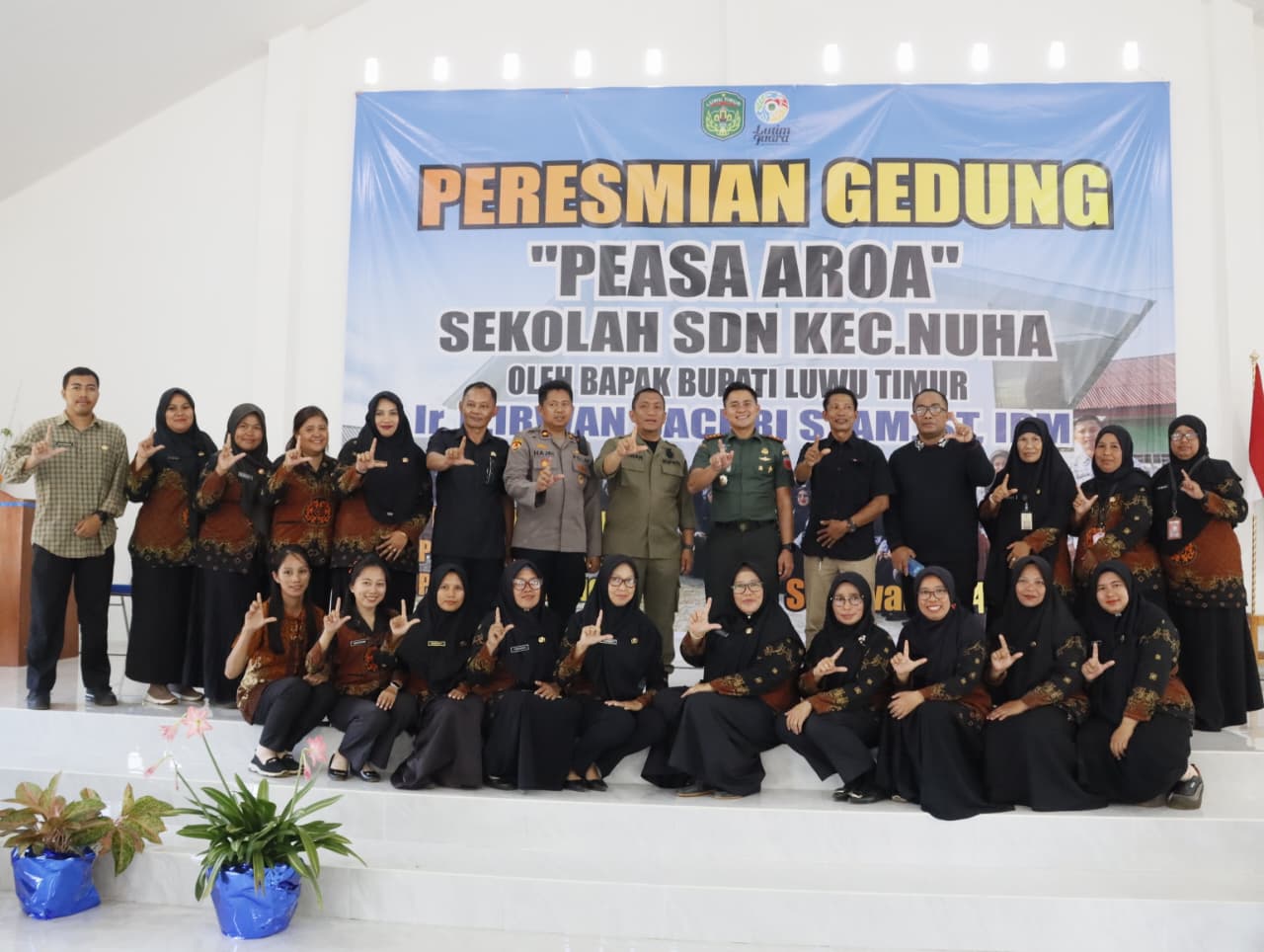 NUHA,FAKJUR-Bupati Luwu Timur, Irwan Bachri Syam meresmikan Gedung Peasa Aroa, merupakan fasilitas bersama yang akan digunakan oleh tiga sekolah, yakni UPT SDN 247 Sorowako, UPT SDN 252 Nikkel, dan UPT 256 Dongi, di Kecamatan Nuha, Kamis (04/12/2025).